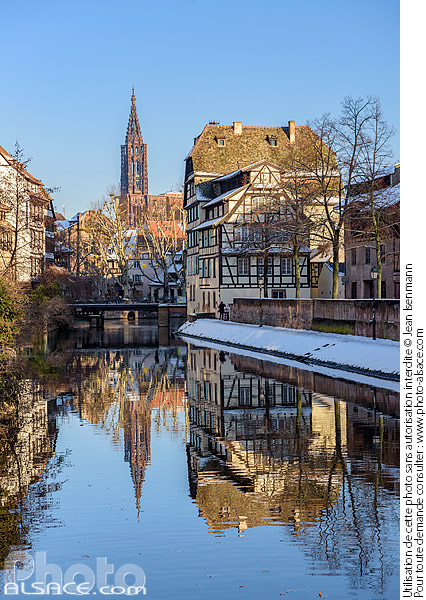 Alsace cathédrale Cathédrale de Strasbourg cours d'eau eau hiver Ill patrimoine Petite France photo vertical Quartier de la Petite France quartier touristique reflet rivière Strasbourg