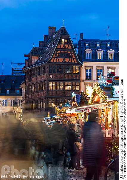 Alsace architecture chalet foule gens Maison Kammerzell marche de noel Marche de Noel de Strasbourg noel nuit patrimoine photo vertical Place de la Cathédrale Strasbourg touriste