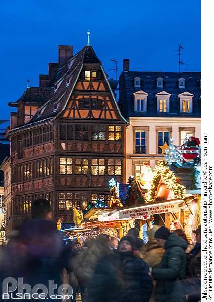 Alsace architecture chalet foule gens Maison Kammerzell marche de noel Marche de Noel de Strasbourg noel nuit patrimoine photo vertical Place de la Cathédrale Strasbourg touriste
