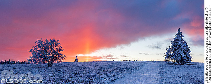 Alsace arbre aube Bas-Rhin Champ du Feu hiver meteo neige paysage paysage de montagne photo panoramique pilier solaire sapin Vosges