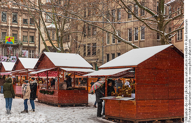Photo : Marché de Noël de la place du Temple Neuf sous la neige, Strasbourg, Bas-Rhin (67) - (ref. 221214-009) © Jean Isenmann