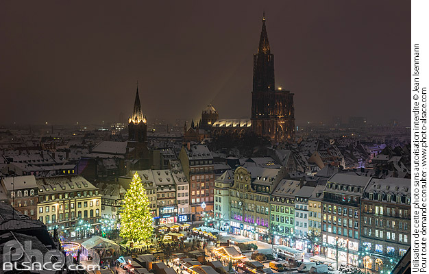 Alsace cathedrale Cathedrale de Strasbourg centre-ville chalet grand sapin de noel hiver illumination illumination de noel marche de noel Marche de Noel de Strasbourg neige nuit photo horizontal Place Kléber Strasbourg vue de haut
