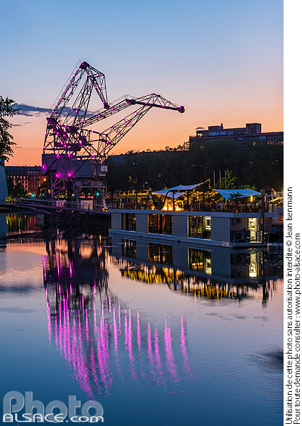 Photo : Illumination au crepuscule des grues du bassin d'Austerlitz et bateau restaurant Blue Flamingo, Presqu'Île Malraux, Strasbourg, Bas-Rhin (67), Alsace, France