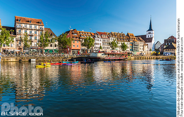 Alsace architecture traditionnelle canoe cours d'eau eglise Eglise Saint-Guillaume facade ill immeuble maison patrimoine quai Quai des Pêcheurs riviere Strasbourg