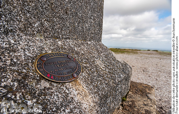 Point du réseau geodesique francais de l'institut national geographique (IGN) au sommt du Ménez Hom, Dinéault, Parc naturel regional d'armorique, Finistère (29)