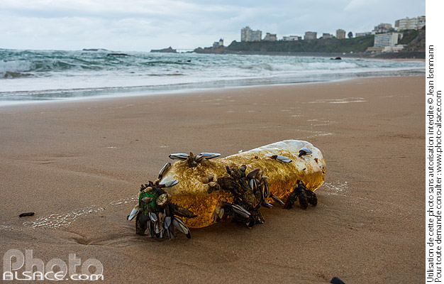 Déchet en plastique recouvert de bernacles (exemple frappant de l'impact de la pollution marine sur les écosystèmes et de la manière dont la faune marine interagit avec les déchets humains), Plage de la côte des Basques, Biarritz, Pyrénées-Atlantiques (64)