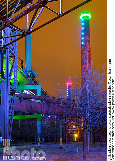 Photo : Landschaftspark Duisburg-Nord la nuit (Conversion d'un site industriel en parc public), Duisburg, Nordrhein-Westfalen, Allemagne, Nordrhein-Westfalen, Allemagne