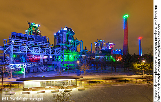 Allemagne Duisbourg haut fourneau illumination nuit parc urbain patrimoine industriel photo horizontal reconversion Rhenanie-du-Nord-Westphalie