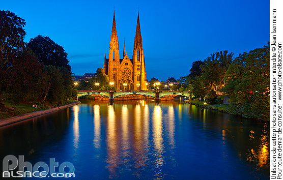 alsace architecture religieuse cours d'eau eau eglise Eglise Saint-Paul ill illumination neustadt nuit patrimoine photo horizontal quartier allemand reflet riviere temple