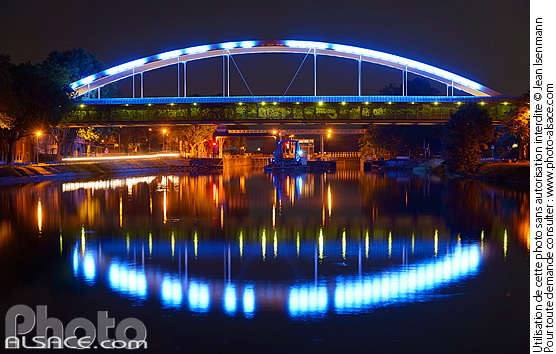 Pont Pierre Brousse la nuit et canal de la Marne au Rhin, Strasbourg, Bas-Rhin (67)
