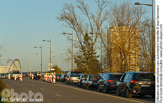Bouchon suite à la remise en place des contrôles à la frontière franco-allemande, Avenue du Pont de l'Europe, Quartier du Port du Rhin, Strasbourg, Bas-Rhin (67)