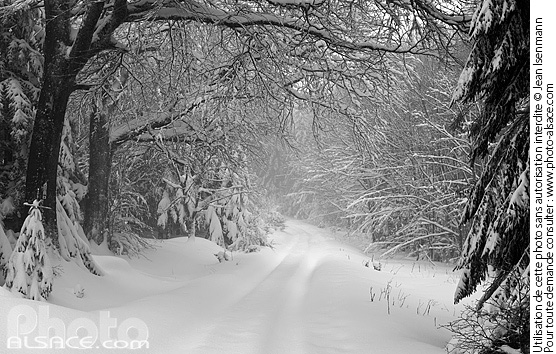 alsace brume chemin chemin de randonnee foret hiver neige photo horizontal photo noir et blanc vosges