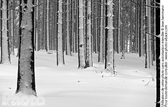 Troncs d'arbre et sous-bois recouvert de neige en hiver, Forêt de Barr, Barr, Bas-Rhin (67)