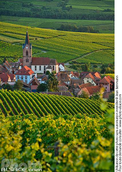 Photo : Village et église de Rodern et en arrière plan le vignoble grand cru Gloeckelberg, Rodern, Haut-Rhin (68) - (ref. 160716-032) © Jean Isenmann