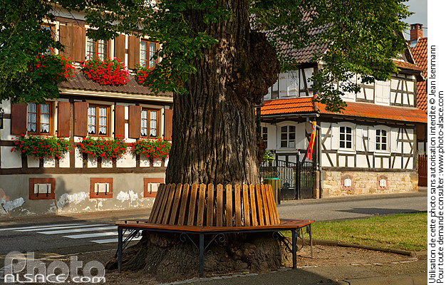 alsace arbre arbre remarquable architecture traditionnelle banc colombage maison alsacienne outre-foret patrimoine photo horizontal tilia platyphyllos tilleul tilleul a grandes feuilles village