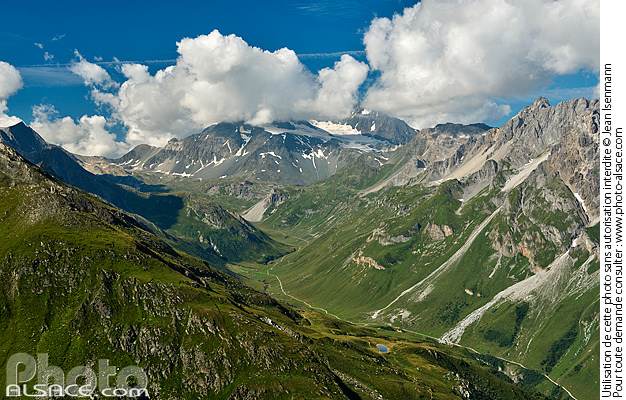 La vallée du Doron de Chavière, le Glacier de Gebroulaz et l'Aiguille de Polset dans les nuages, Pralognan-la-Vanoise, Parc national de la Vanoise, Savoie (73)