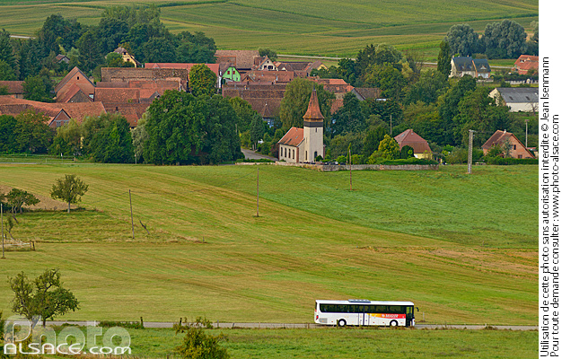 alsace architecture religieuse autocar bus champ eglise Issenhausen pays de hanau paysage paysage agricole photo horizontal transport en commun village