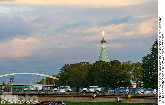 architecture religieuse circulation automobile circulation difficile clocher eglise eglise orthodoxe patrimoine photo horizontal pont Strasbourg voiture