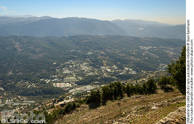Culture en serres dans la montagne vue depuis l'ermitage de Saint-Charbel, Mont-Liban, Liban