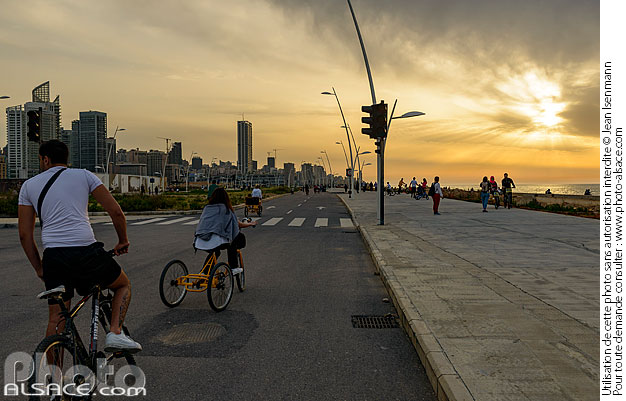 Nouveau secteur du port au coucher de soleil utilisé par les Beyrouthins comme parc urbain pour y faire du vélo, du sport ou simplement s'y promener, Marfaa, Beyrouth, Liban