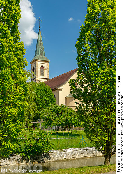 alsace arbre architecture religieuse clocher cours d'eau eglise Eglise Saint-Martin Ill Oltingue patrimoine photo vertical printemps riviere Sundgau