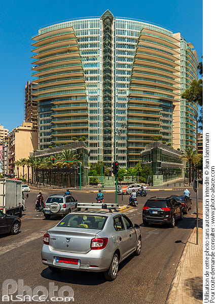 architecture architecture contemporaine Beirut Beyrouth circulation automobile façade habitat habitat collectif immeuble immeuble de logement laveur de vitres Lebanon Liban photo vertical Proche-Orient Ras Beyrouth Snoubra Verdun Gardens voiture