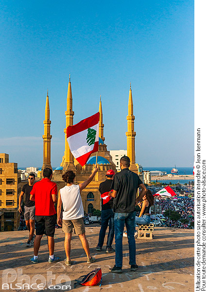 Jeunes manifestants sur le toit de the Egg face à la mosquée Mohammad al Amine, Sixième jour de manifestation à Beyrouth contre les augmentations d'impôts et la corruption, Révolution d'octobre au Liban, Beyrouth, Liban