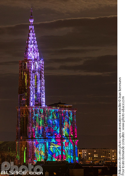 Photo : Les illuminations 2020 de la cathédrale de Strasbourg et les toits de Strasbourg, Strasbourg, Bas-Rhin (67) - (ref. 200903-081) © Jean Isenmann