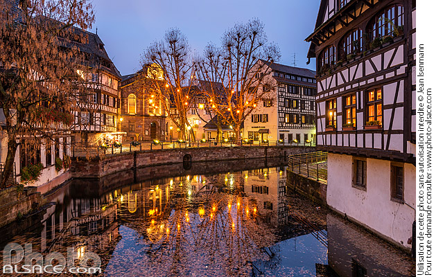 Alsace architecture traditionnelle colombage cours d'eau Ill illumination illumination de noel maison alsacienne noël nuit patrimoine Petite France photo horizontal place Place Benjamin Zix Quartier de la Petite France rivière Strasbourg