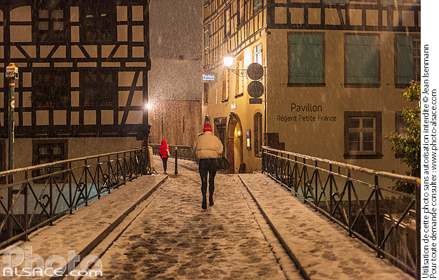 Alsace centre-ville hiver neige nuit Petite France photo horizontal piéton pont Pont du Faisan pont tournant Quartier de la Petite France quartier touristique Strasbourg ville