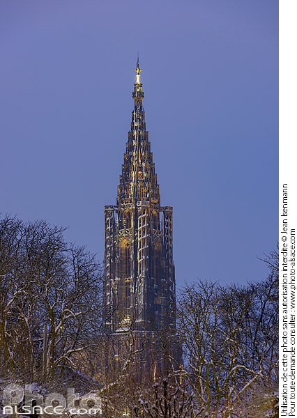 Alsace architecture religieuse cathédrale Cathédrale de Strasbourg centre-ville fleche hiver neige Neustadt nuit patrimoine photo vertical quartier allemand Strasbourg