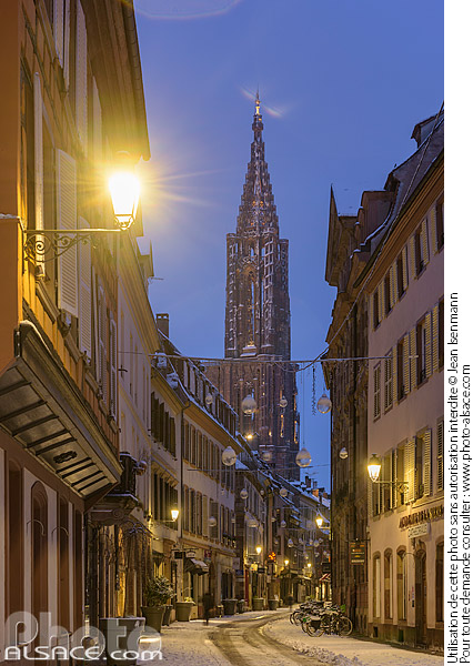 Alsace architecture religieuse cathédrale Cathédrale de Strasbourg centre-ville eclairage public hiver lampadaire neige nuit patrimoine photo vertical rue Rue des Juifs Strasbourg