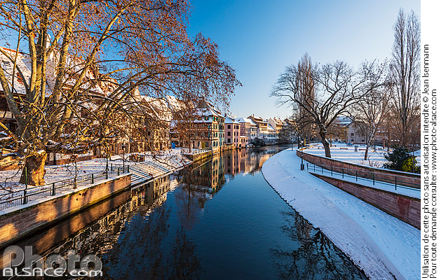 Alsace architecture traditionnelle berge colombage cours d'eau hiver Ill maison alsacienne neige patrimoine Petite France photo horizontal quai Quai de la Petite France Quartier de la Petite France quartier touristique rivière Strasbourg
