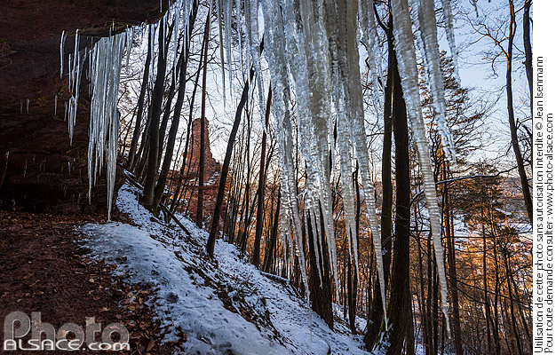 Alsace architecture medievale Bas-Rhin Château du Petit Arnsbourg Château du Petit-Arnsberg chateau foret glace hiver Obersteinbach parc naturel parc naturel regional patrimoine photo horizontal stalactite vosges du nord