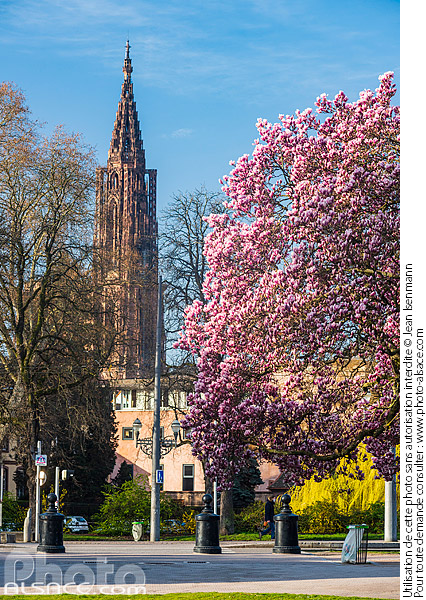 Alsace arbre architecture religieuse Cathédrale de Strasbourg cathedrale espace vert fleur floraison magnolia Neustadt patrimoine photo vertical place Place de la Republique printemps quartier allemand rose Strasbourg patrimoine mondial UNESCO