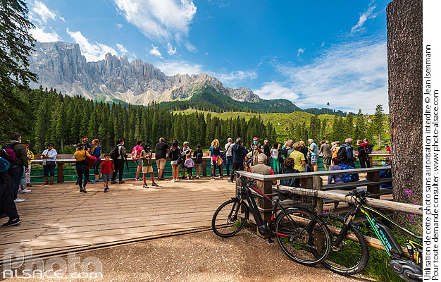 Alpes amenagement touristique chemin Dolomites foret foule Italie lac Lac de Carezza Lago di Carezza Latemar montagne patrimoine mondial UNESCO patrimoine naturel paysage de montagne photo horizontal surfréquentation touriste Trentin-Haut-Adige