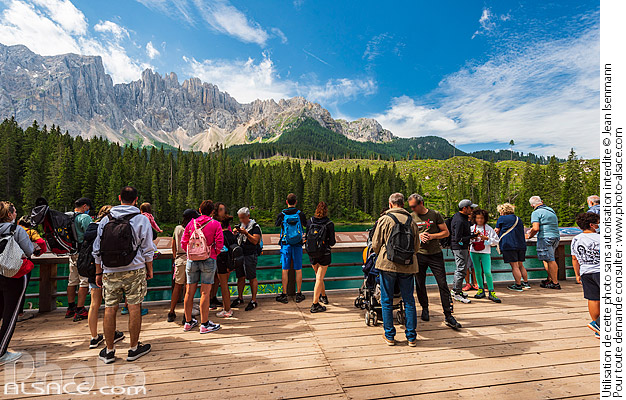 Alpes amenagement touristique chemin Dolomites foret foule Italie lac Lac de Carezza Lago di Carezza Latemar montagne patrimoine mondial UNESCO patrimoine naturel paysage de montagne photo horizontal surfréquentation touriste Trentin-Haut-Adige