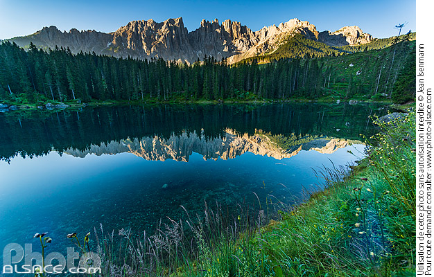 Photo : Lac de Carezza (Lago di Carezza) et le Latemar en arrière plan, Nova Levante, Dolomites, Trentin-Haut-Adige, Italie - (ref. 210729-025) © Jean Isenmann