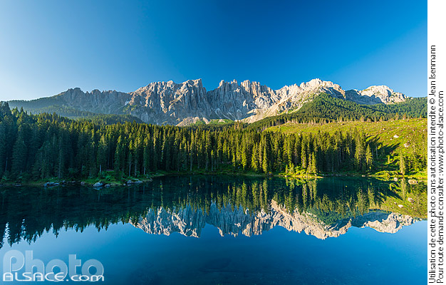 Photo : Lac de Carezza (Lago di Carezza) et le Latemar en arrière plan, Nova Levante, Dolomites, Trentin-Haut-Adige, Italie - (ref. 210729-051) © Jean Isenmann