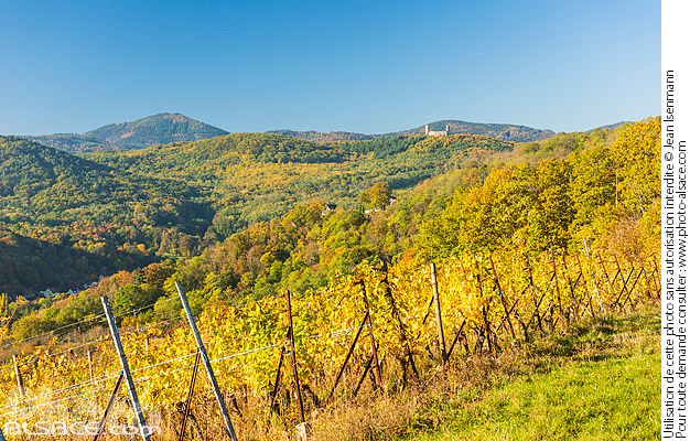 Photo : Vignoble grand cru du Kirchberg, les Vosges et le château d'Andlau en automne, Barr, Bas-Rhin (67) - (ref. 211024-015) © Jean Isenmann