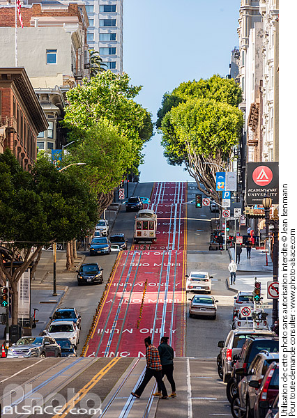 cable car Californie Etats-Unis ligne de tramway Muni pente photo vertical pieton Powell Street rue San Francisco tramway Union Square USA