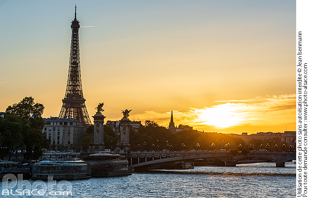 architecture contre-jour Grand Paris Ile-de-France lampadaire ouvrage d'art Paris patrimoine photo horizontal pont Pont Alexandre III soleil soleil (coucher) tour eiffel
