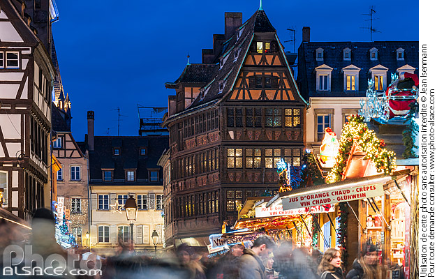 Alsace architecture chalet foule gens Maison Kammerzell marche de noel Marche de Noel de Strasbourg noel nuit patrimoine photo horizontal Place de la Cathédrale Strasbourg touriste