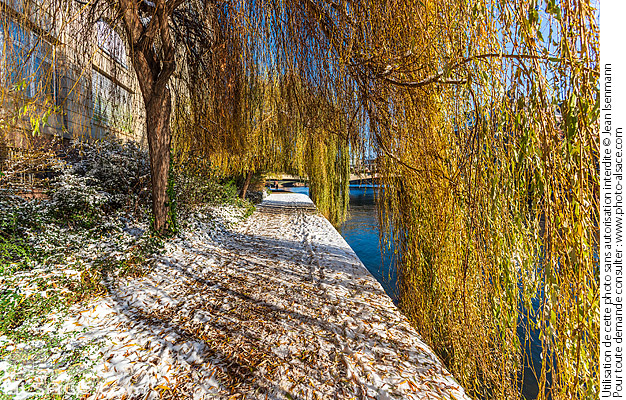 Alsace arbre berge cours d'eau hiver Ill neige photo horizontal riviere salix babylonica saule pleureur Strasbourg