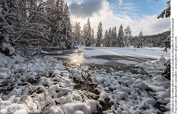 arbre contre-jour hiver lac Lac de Lispach Lispach Lorraine neige Parc naturel régional des Ballons des Vosges parc naturel regional paysage de montagne paysage hivernal photo horizontal sapin tourbiere Vosges
