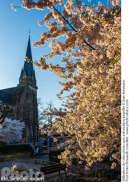 Alsace arbre architecture religieuse eglise Eglise Saint-Maurice fleur photo vertical place Place Arnold printemps square Strasbourg