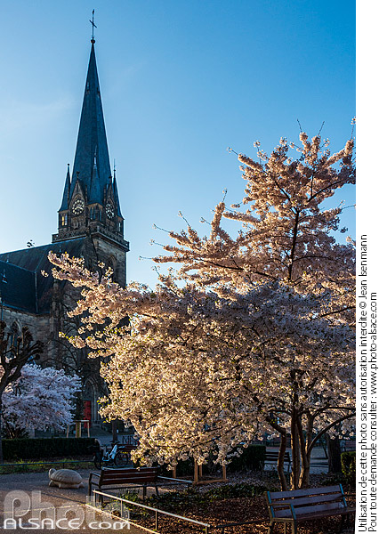 Alsace arbre architecture religieuse eglise Eglise Saint-Maurice fleur photo vertical place Place Arnold printemps square Strasbourg