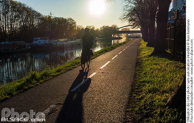 Alsace Canal de la Marne au Rhin contre-jour cycliste photo horizontal piste cyclable soleil Strasbourg