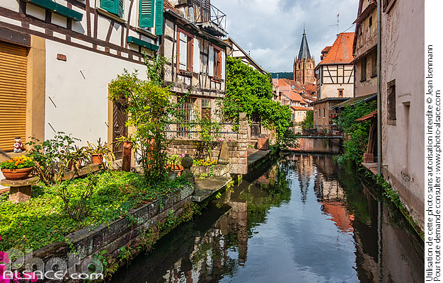 Photo : Le Schlupf (ou la Petite Venise de  Wissembour) vue sur la Lauter et l'abbatiale Saint-Pierre et Paul, Wissembourg, Bas-Rhin (67) - (ref. 230725-009) © Jean Isenmann