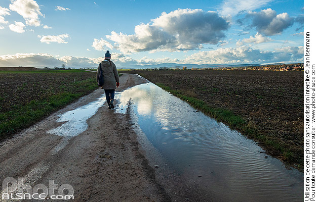 Alsace Bas-Rhin Breuschwickersheim eau femme flaque nuage paysage agricole personne reflet